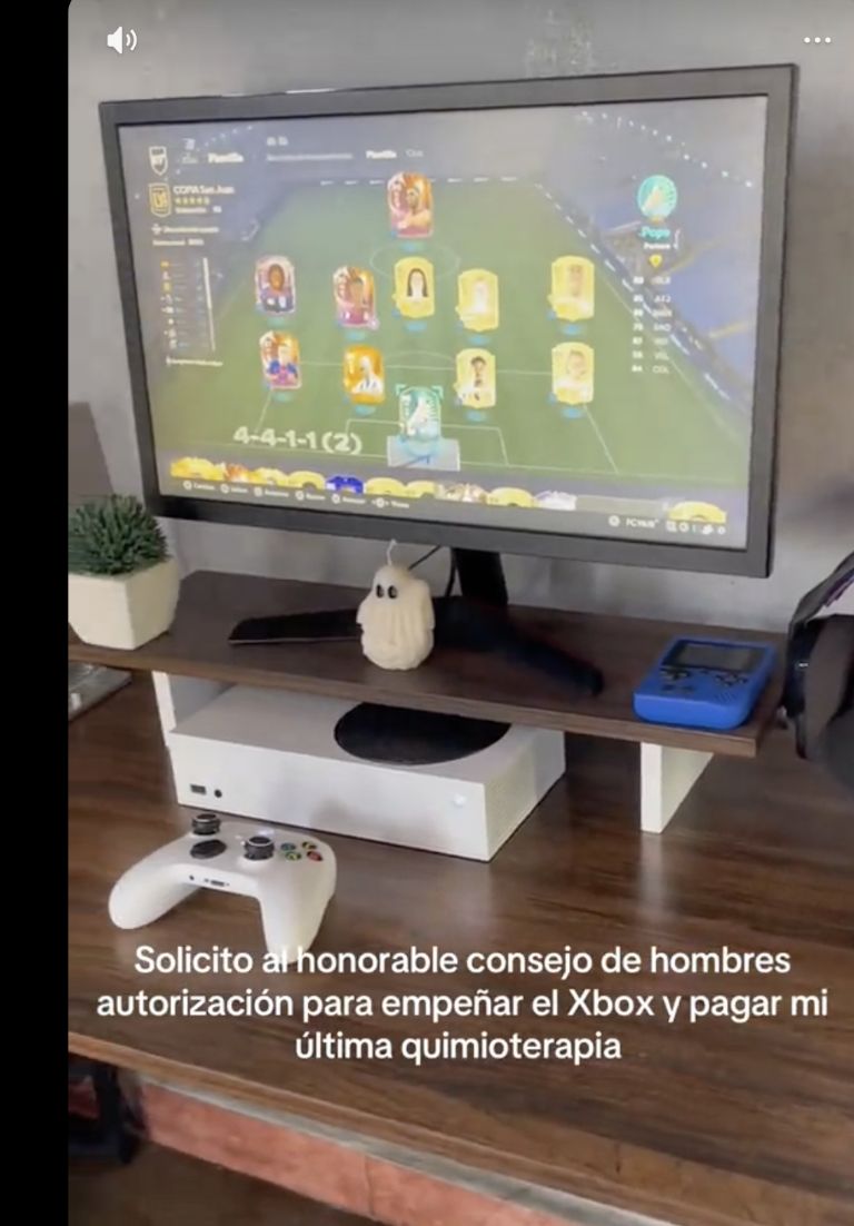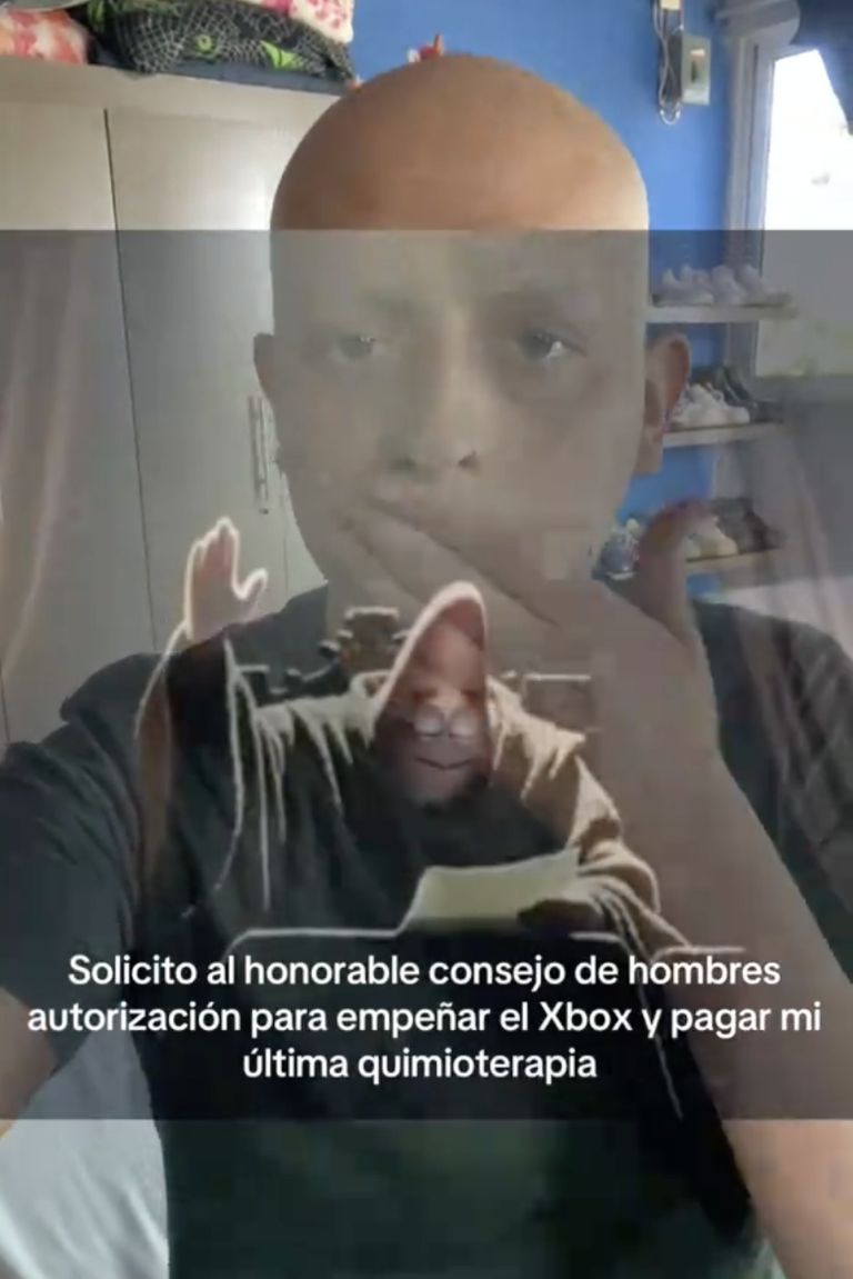 “Solicito al honorable consejo de hombres autorización para empeñar el Xbox y pagar mi última quimioterapia”, escribió en su cuenta de TikTok.