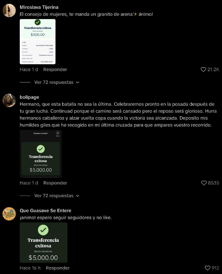 “El consejo siempre apoya hermano”, “Mándame mensaje, yo te ayudo”, “El consejo de mujeres te manda un granito de arena. Ánimo”, “Hermano, que esta batalla no sea la última. Celebramos pronto en la posada después de tu gran lucha…”, son algunos de los mensajes que se pueden encontrar en la publicación de juan8axd, acompañados de capturas de pantalla que evidencian transferencias bancarias. Las contribuciones variaron desde los 500 pesos hasta los 5,000 pesos.