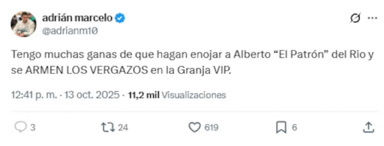 “Tengo muchas ganas de que hagan enojar al Alberto del Río y se ARMEN LOS VE$%& en La Granja VIP”, expresó Adrián Marcelo en su perfil oficial de X.