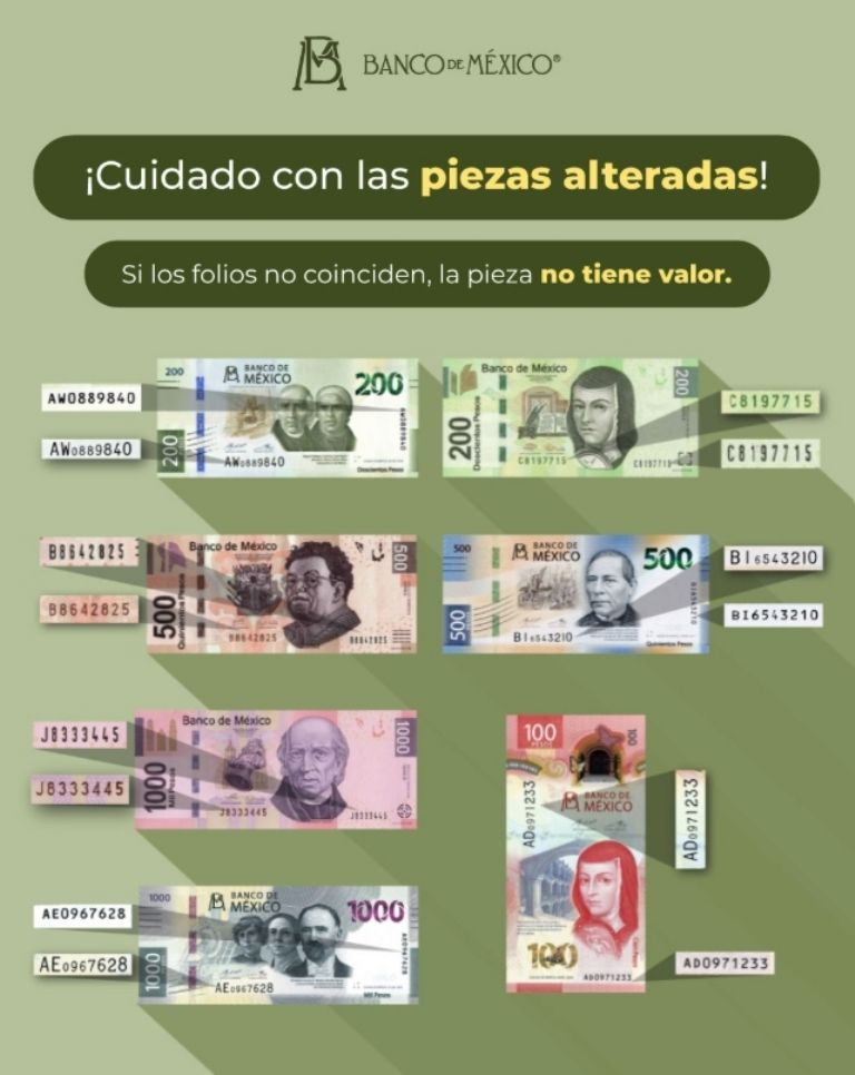 La autoridad monetaria de México ha emitido una advertencia para que los ciudadanos permanezcan vigilantes. La creación de billetes falsos es una infracción seria y lamentablemente recurrente. Por esta razón, a través de sus plataformas digitales, la institución financiera ha aconsejado la revisión del papel moneda. Esto es particularmente importante al recibir ejemplares de 200, 500 y 1000 pesos pertenecientes a las series F y G, así como billetes de 100 pesos de la serie G.