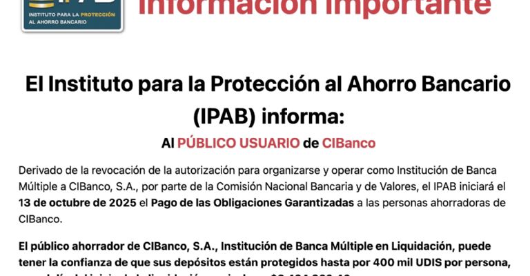 El IPAB ha informado que las sucursales de CIBanco cesarán sus operaciones el 10 de octubre de 2025. Sin embargo, más de 200 puntos de atención a nivel nacional continuarán brindando servicio al público a partir del 13 de octubre de 2025. El horario de atención será de lunes a jueves de 9:00 a 18:00 horas y los viernes de 9:00 a 14:00 horas. Es posible consultar el listado completo en este enlace.