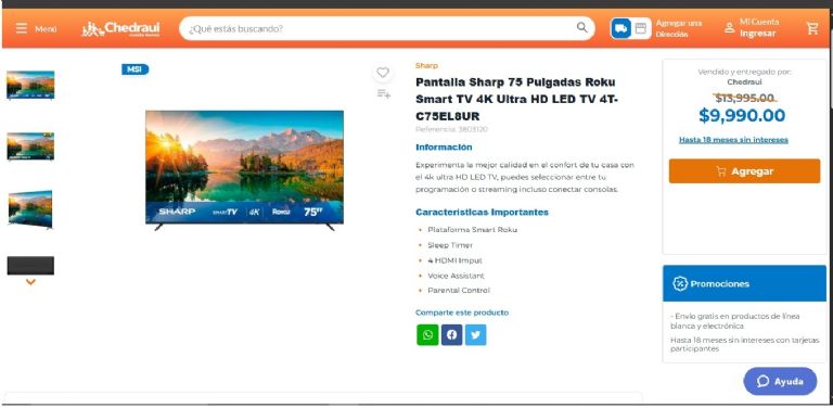 El comercio Chedraui ha rebajado considerablemente una televisión inteligente Sharp de 75 pulgadas, ofreciéndola a un precio que representa una disminución cercana al 30% sobre su coste normal. Este dispositivo destaca por su amplía pantalla con resolución 4K y el sistema operativo Roku, ideal para quienes desean optimizar su espacio de entretenimiento y convertirlo en una experiencia cinematográfica. La promoción está especialmente dirigida a consumidores interesados en mejorar su entretenimiento y aprovechar un descuento sustancial antes de que el inventario se agote.