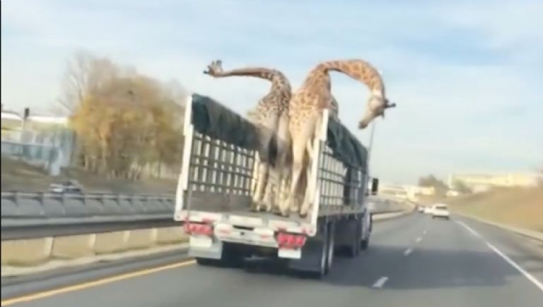 Un video que circula en la esfera digital ha captado la atención de muchos, pues muestra a dos jirafas en lo que parece ser un incidente durante su traslado en un vehículo blanco sin protección superior ni puertas. Las imágenes dan cuenta de cómo los animales son movilizados a alta velocidad, y al pasar bajo un paso elevado, sus cabezas impactan contra el concreto, quedando inmóviles sobre el transporte.