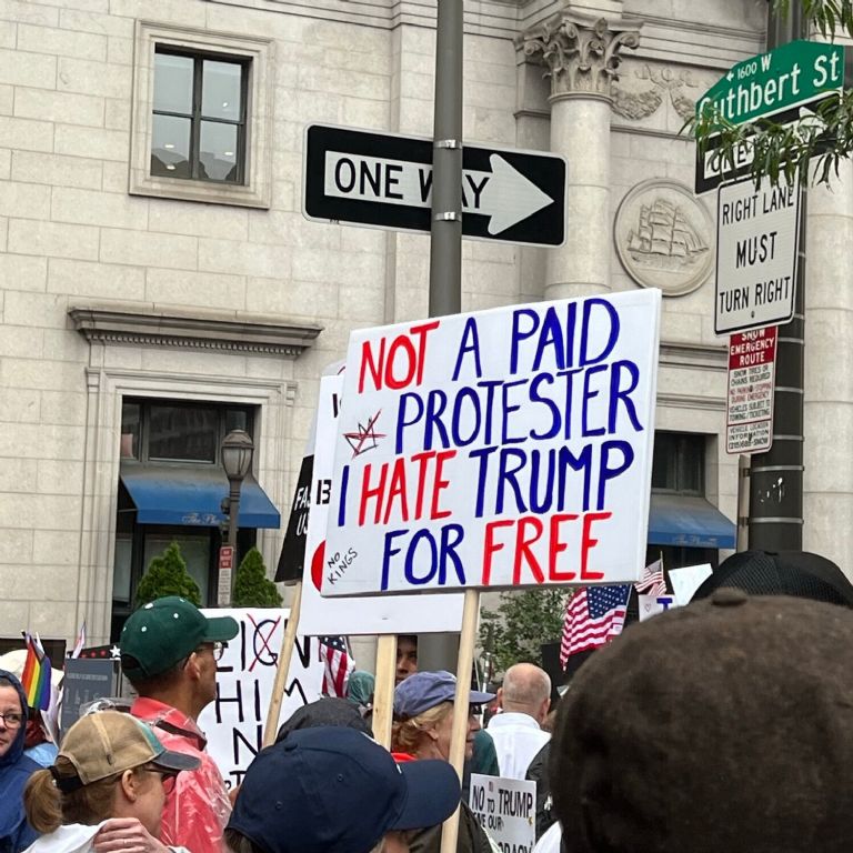 Brian Lee, un veterano de 70 años originario de Pensilvania, exhibió un cartel que decía: “Mi padre no luchó en Europa para esto”. A los medios locales, afirmó: “Trump evoca lo que vivimos en los años treinta. Está emprendiendo un camino arriesgado y debemos detenerlo antes de que sea irreversible”.