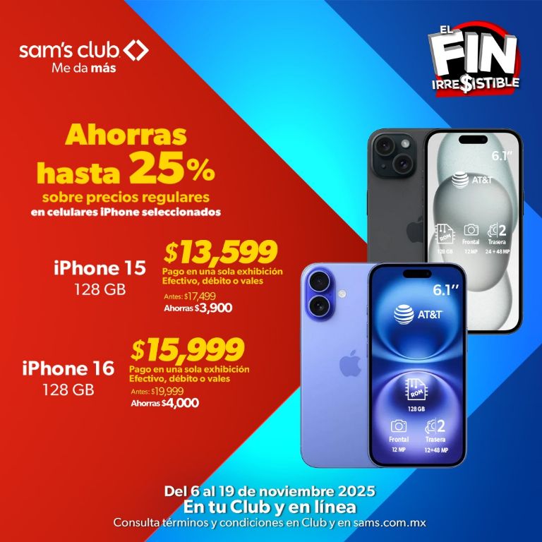 Durante el evento “El Fin Irresistible 2025”, los clientes de Sam’s Club tendrán la oportunidad de beneficiarse de descuentos de hasta el 25% en modelos seleccionados de iPhone. Esto se traduce en la posibilidad de ahorrar hasta 4,000 pesos. Es importante destacar que estas reducciones de precio estarán disponibles tanto en tiendas físicas como en la plataforma online. Para hacer válidos los descuentos, el pago deberá realizarse en una sola transacción, ya sea en efectivo, con tarjeta de débito o mediante vales.