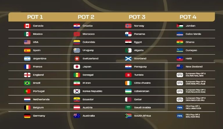 • Bombo 4: Jordania, Cabo Verde, Ghana, Curasao, Haití, Nueva Zelanda, clasificados A, B, C y D de las eliminatorias europeas, y los clasificados 1 y 2 del torneo de repechaje de la FIFA.