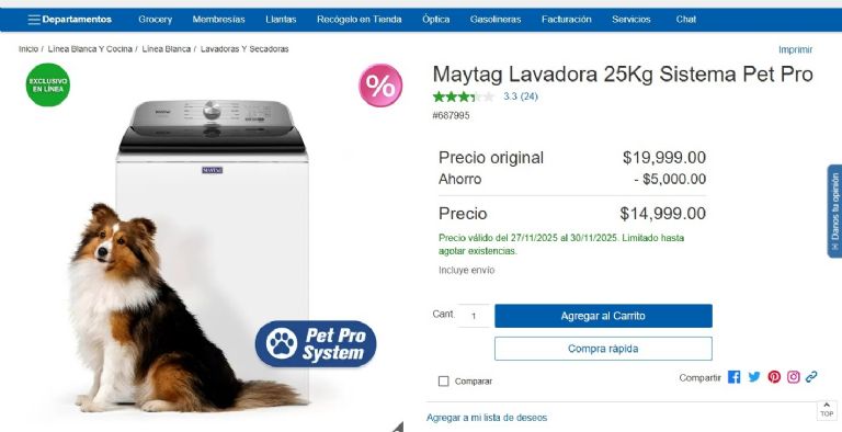 La lavadora Maytag de 25 kg con Pet Pro System es la combinación perfecta de amplia capacidad, funciones especializadas para hogares con mascotas, versatilidad en ciclos de lavado y un precio extraordinario gracias al descuento que ofrece Costco. Si buscas eficiencia, potencia, y un lavado de calidad superior sin comprometer tu presupuesto, esta lavadora Maytag se posiciona como una alternativa altamente recomendable para ti. ¡No dejes pasar esta oferta exclusiva!