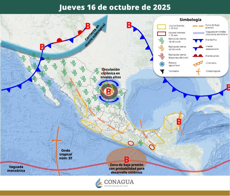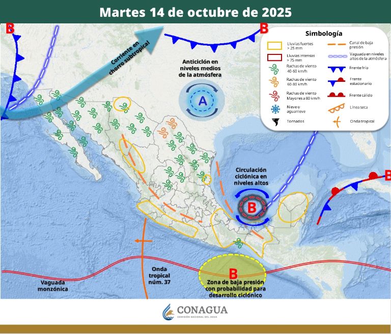 La aproximación de un nuevo **frente frío** y la corriente en chorro subtropical al noroeste del país traerán consigo **fuertes ráfagas de viento** en esa región. Adicionalmente, la onda tropical número 37, ubicada al sur de las costas de Guerrero y Michoacán, interactuará con un canal de baja presión, generando **chubascos y lluvias fuertes** en el occidente, centro y sur del territorio nacional.