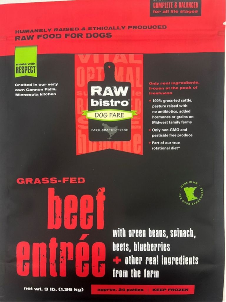 - Raw Bistro Dog Fare – Plato Principal de Carne de Res Alimentada con Pasto (Congelado – a Granel): En cajas de 18 lb, con el código UPC 858833002629, lote número 239 y fecha de consumo preferente 27/08/2026.