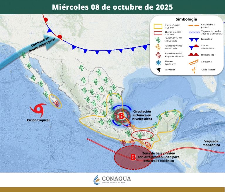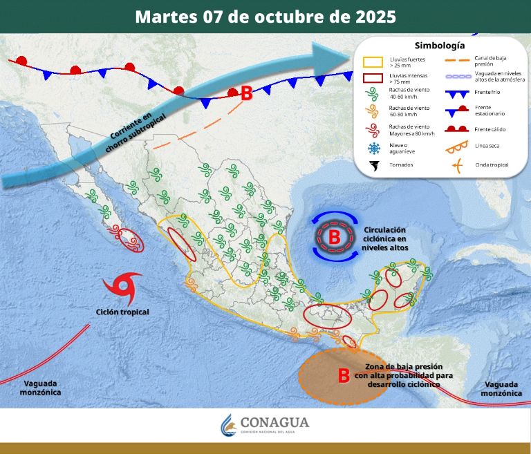 La temporada de precipitaciones aún se mantiene activa. Un sistema de baja presión en el interior de México, combinado con la humedad proveniente del Océano Pacífico y el Golfo de México, provocará chubascos y lluvias intermitentes. Estas condiciones afectarán principalmente al noroeste, norte, noreste y centro de la República Mexicana. Se pronostican lluvias fuertes y focalizadas en estados como Nayarit, Estado de México, Ciudad de México y Morelos.