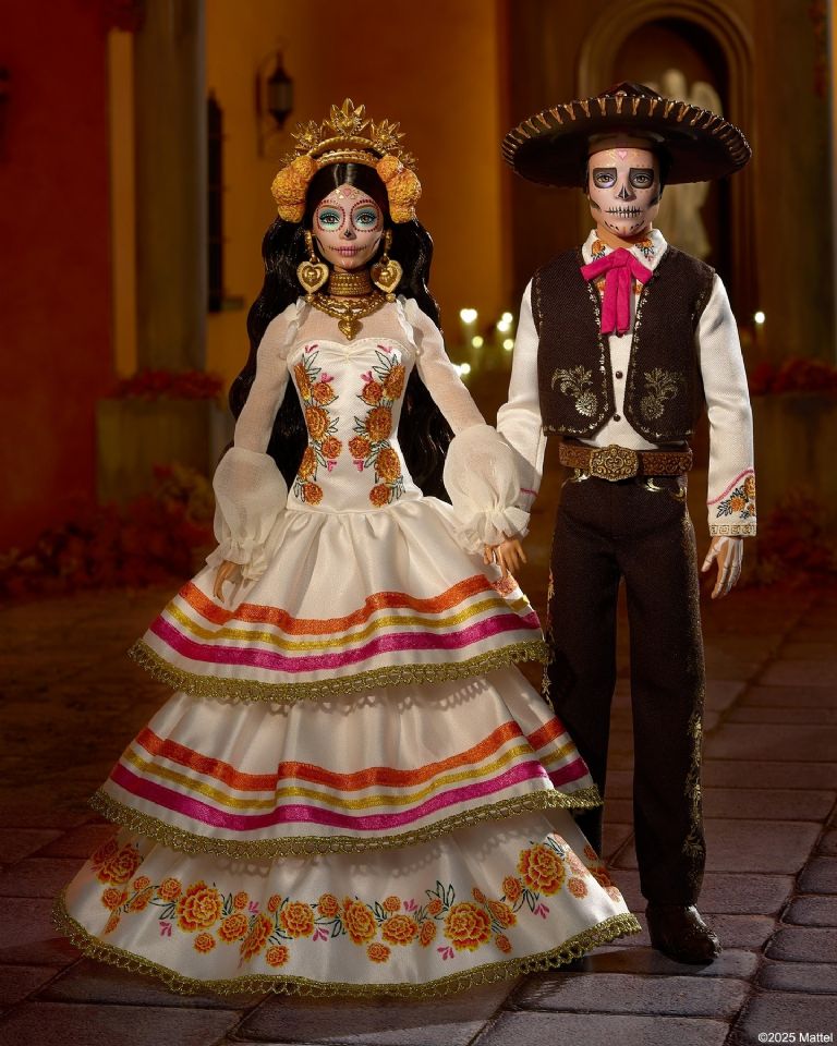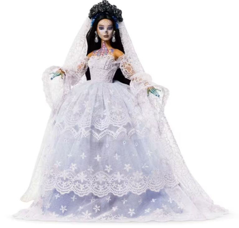 - Barbie Día de Muertos (La Catrina): El atuendo de esta muñeca está exquisitamente inspirado en la flor de cempasúchil, un elemento indispensable en los altares y tumbas. Su elegante vestido color crema, con mangas translúcidas, se complementa con pendientes largos y collares superpuestos que realzan su diseño. Su valor aproximado es de 2,900 pesos.