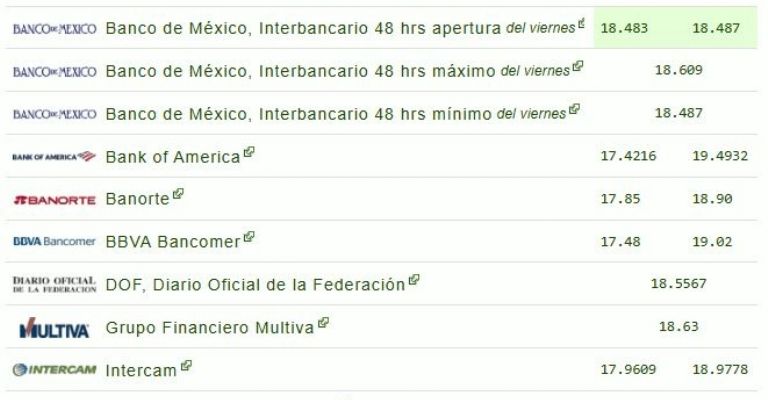 - BBVA: Compra en 17.48 / Venta en 19.02