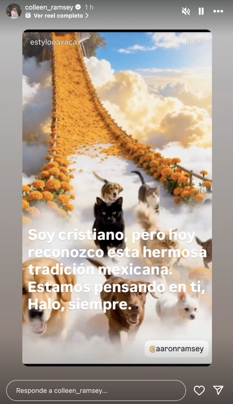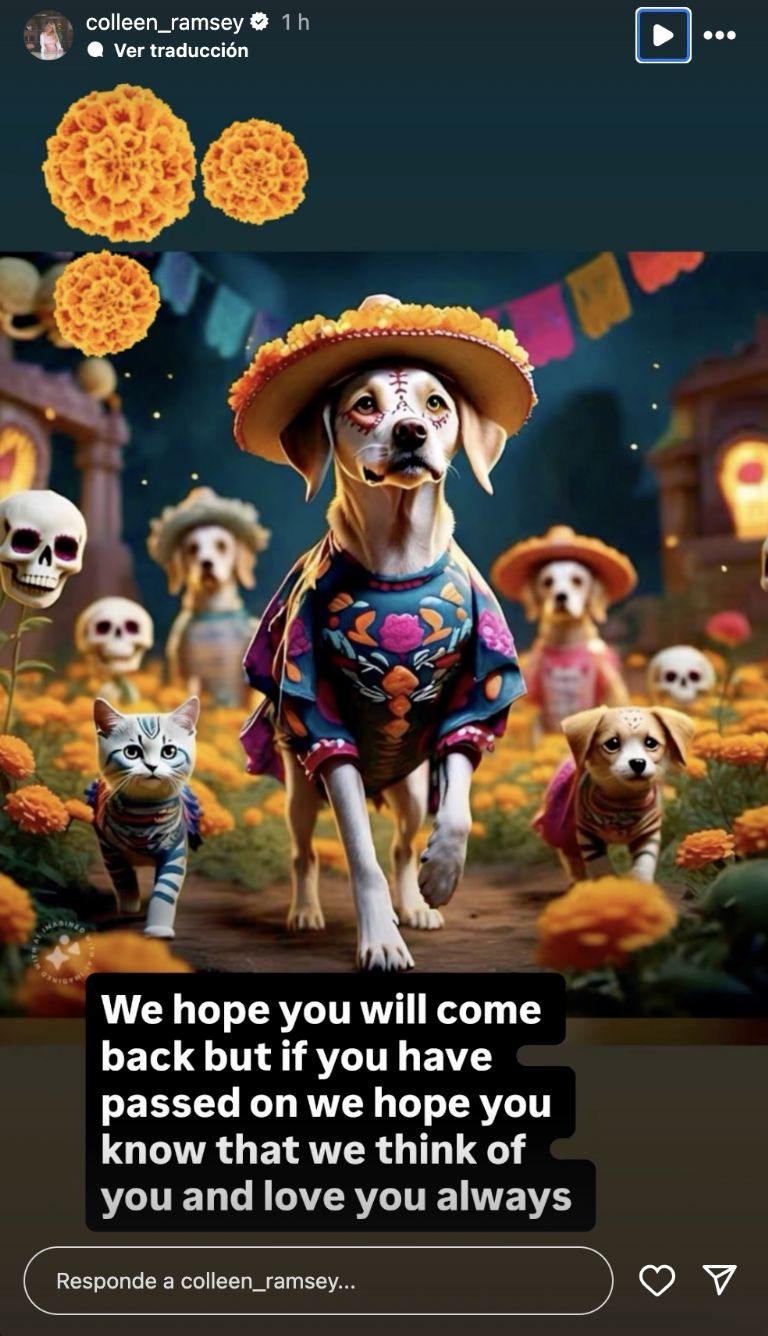 La segunda publicación de Colleen incluyó una animación generada por IA, que retrataba a diversos perros llegando a una ofrenda, en alusión al 27 de octubre, una fecha significativa en México para honrar la memoria de las mascotas que ya no nos acompañan.