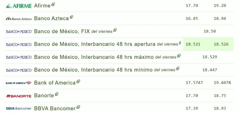 - BBVA: Compra: 17.39 – Venta: 18.93