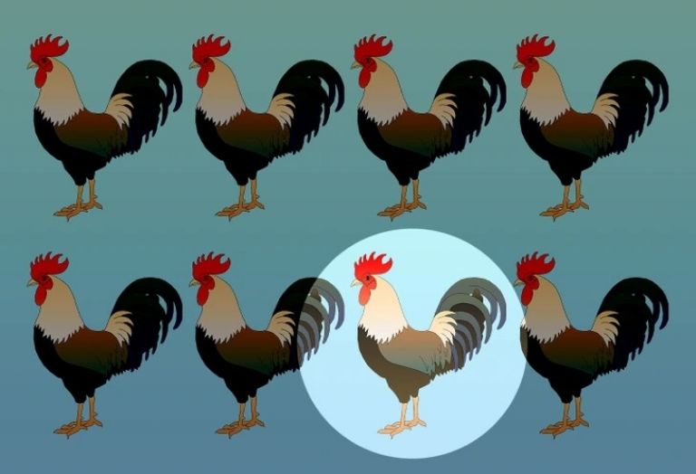 IDENTIFICA LA DIFERENCIA CLAVE: Al primer vistazo, todos los gallos de la imagen parecen ser idénticos. La tarea puede parecer desalentadora, y es muy probable que necesites repasar los detalles detenidamente varias veces para detectar la sutil discrepancia.
