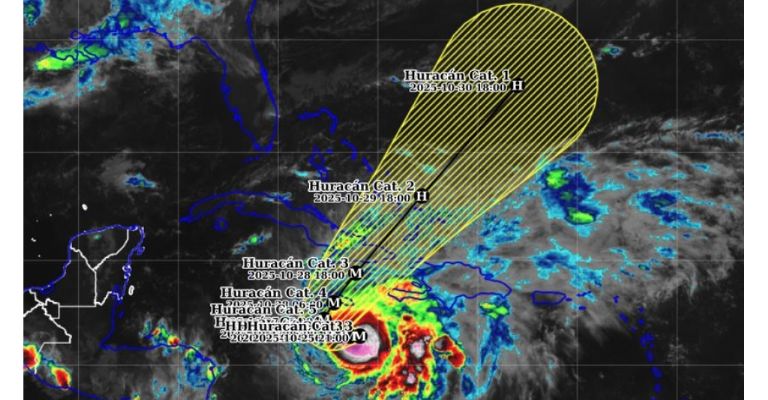 Actualmente, el huracán avanza con una velocidad moderada de 6 km/h en dirección oeste. Las previsiones oficiales, emitidas a las 23:00 UTC, indican que el centro de este sistema meteorológico podría pasar muy cerca o impactar directamente sobre Jamaica durante el fin de semana, extendiéndose hasta el inicio del próximo lunes 27 de octubre.