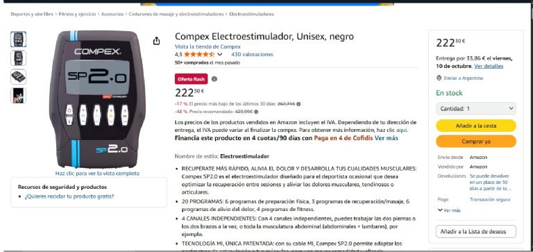 El factor más determinante en su creciente popularidad es, sin duda, su precio accesible. Mientras que en la página oficial de la marca el **Compex SP 2.0** tiene un valor de 429,99 euros, en Amazon España puedes adquirirlo por tan solo 222 euros. Esta diferencia supone un ahorro sustancial de más de 200 euros. Es importante destacar que esta excepcional **oferta** forma parte de la reconocida **Fiesta de Ofertas Prime**, que se celebra los días 7 y 8 de octubre, y está disponible exclusivamente para los miembros del servicio Prime.