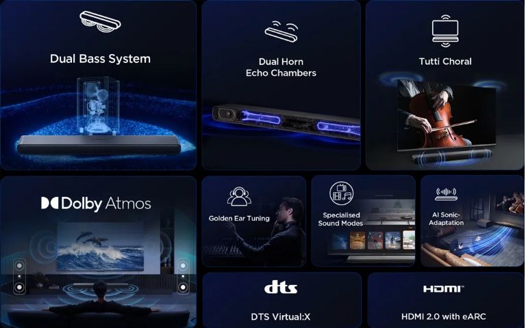 El sistema de sonido **TCL S45H** redefine la experiencia audiovisual. Esta **barra de sonido 2.0** de última generación integra tecnologías punteras como **Dolby Atmos y DTS Virtual:X**. Estas innovaciones crean una atmósfera de audio tridimensional, permitiéndote disfrutar de efectos envolventes incluso sin la necesidad de un subwoofer externo. Su potencia se complementa con un sistema de doble parlante de bajos, diseñado para realzar las frecuencias graves, otorgando mayor nitidez, profundidad y resonancia a tus películas, series y música favorita. Además, su conectividad versátil con **Bluetooth, HDMI eARC** y la función de ajuste automático del sonido al entorno garantizan una compatibilidad y adaptación sin precedentes a tu televisor y a cualquier espacio.