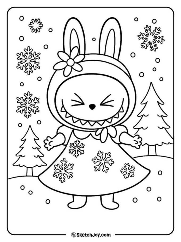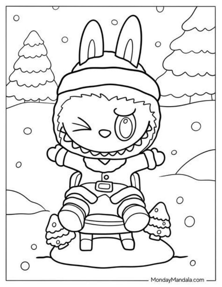 En 2019, Kasing Lung y Pop Mart sellaron una alianza estratégica para la producción oficial de Labubu como artículos de colección, introducidos al mercado a través del popular formato de cajas sorpresa. Desde entonces, la popularidad de estas adorables figuras ha experimentado un crecimiento exponencial, expandiéndose a una vasta gama de productos. Las imágenes para colorear, en particular, son un éxito rotundo entre los fans, y aquí compartimos una escena nevada que captura la esencia de la Navidad.