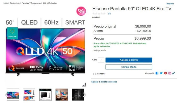 Otra oferta destacada de Costco para este fin de semana del sábado 1 y domingo 2 de noviembre es la impresionante pantalla Hisense de 50 pulgadas QLED 4K Fire TV. Con un descuento de 2,000 pesos, podrás adquirirla por tan solo 6,999 pesos, ¡y el envío está cubierto! Disfruta de una experiencia visual inmersiva a un precio inmejorable.