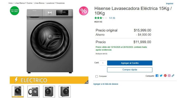 Los miembros de Costco tienen una oportunidad única para adquirir una lavasecadora eléctrica Hisense de 15kg/10kg con un descuento de $4,000. Esta oferta, válida únicamente entre el sábado 25 y domingo 26 de octubre, deja el precio final en tan solo $11,999, e incluye el servicio de entrega a domicilio. La promoción es exclusiva para compras realizadas a través de la plataforma en línea de Costco.