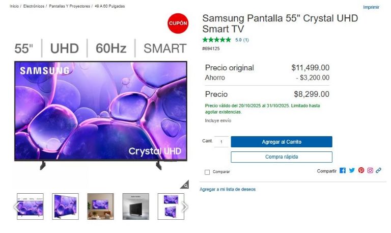 Otra oferta destacada de Costco para este fin de semana del sábado 25 y domingo 26 de octubre es el generoso descuento de $3,200 en la pantalla Samsung de 55’’ Crystal UHD Smart TV. Los miembros de Costco podrán adquirir esta potente Smart TV por un precio excepcional de $8,299, con entrega a domicilio incluida en la promoción.