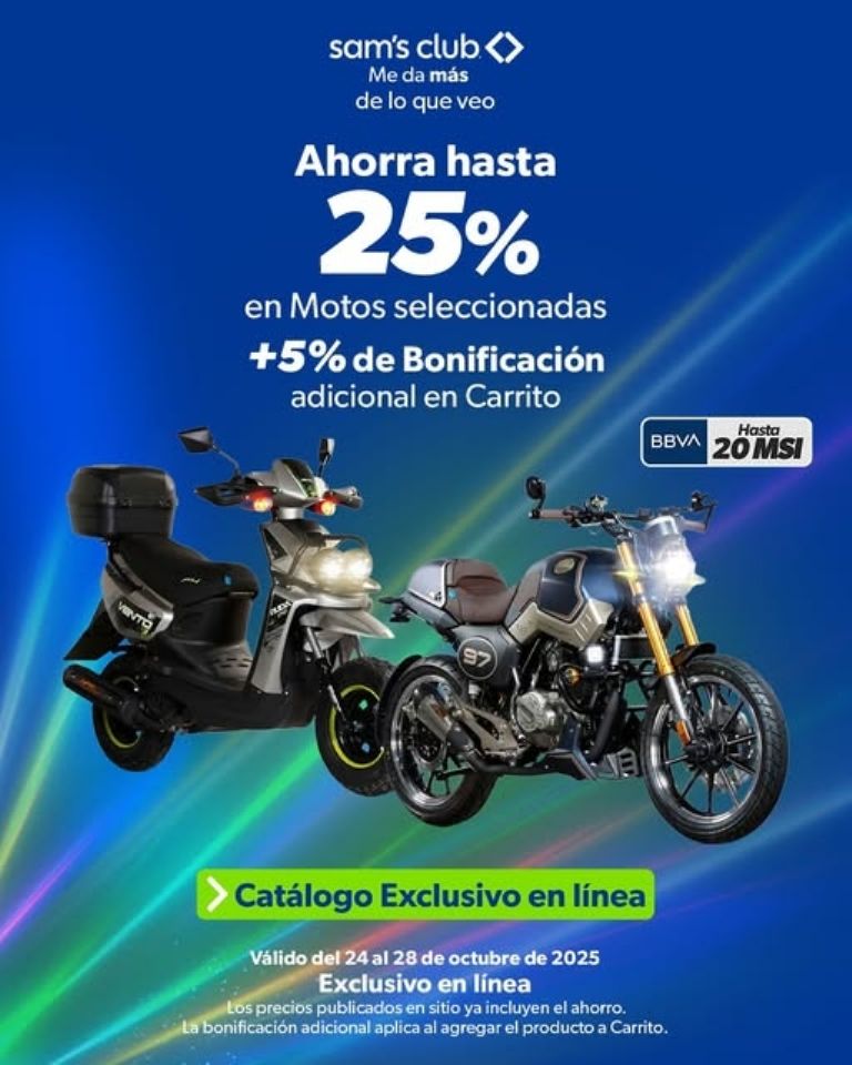Sam’s Club sorprende a sus socios con una promoción de hasta el 25% de descuento en una selección especial de motocicletas, disponible durante el fin de semana del sábado 25 y domingo 26 de octubre. Para potenciar aún más el ahorro, se suma un 5% de bonificación adicional en el carrito de compras. Además, para facilitar tu compra, los pagos de estos vehículos pueden realizarse hasta en 20 meses sin intereses, utilizando tarjetas de crédito participantes. Recuerda que esta atractiva oferta es válida solo para compras en línea.