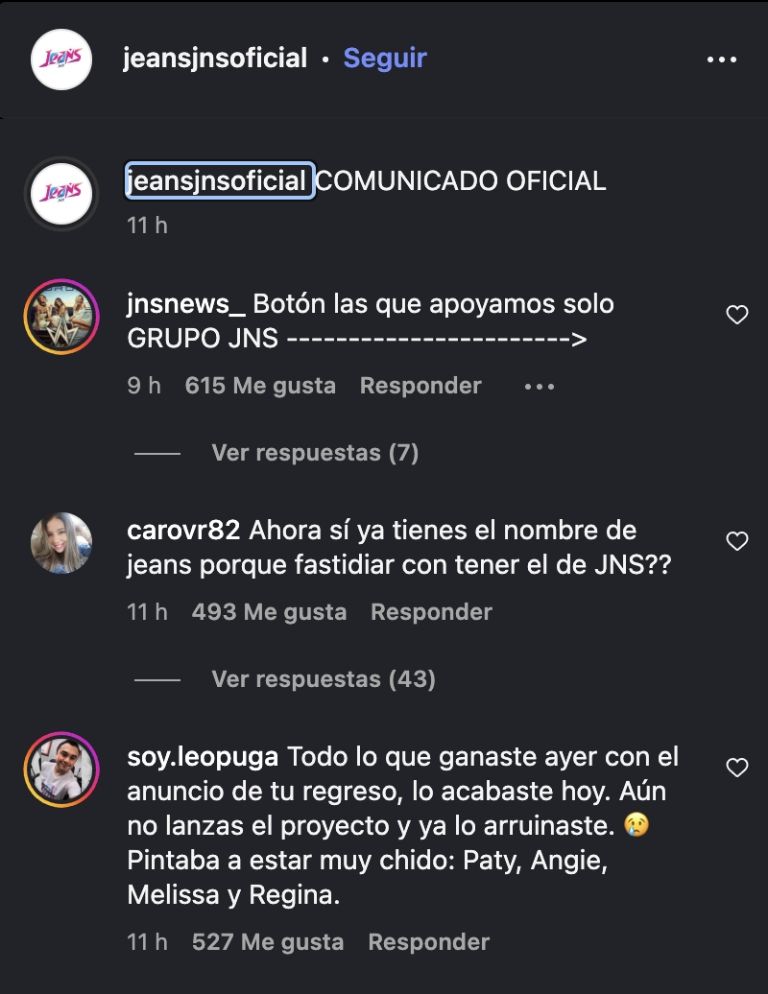 “Podrán quitarles el nombre, pero jamás su talento ni carisma. Y eso es lo que realmente vende, algo que este proyecto (de Paty Sirvent) difícilmente podrá replicar”, “Mejor concéntrate en tu proyecto de Paty Lu y deja de lado la envidia. Ahora resulta que le quieres arrebatar el nombre a Luli Pampín, como si su propuesta infantil fuera menos exitosa”, “Qué afán de generar conflictos innecesarios. Se llamen como se llamen, mi apoyo total para @angietaddei, @melissalz83, @murguiaregina y quienes las acompañen en su camino”, “Todo el impulso ganado ayer con el anuncio de tu regreso, lo has perdido hoy. Sin siquiera haber lanzado el proyecto, ya lo has arruinado por completo”, “Ahora sí tienes el nombre de Jeans, ¿entonces para qué insistir en obstaculizar el de JNS?”, son algunos de los contundentes comentarios que inundan las redes sociales, reflejando el sentir general de los fans.