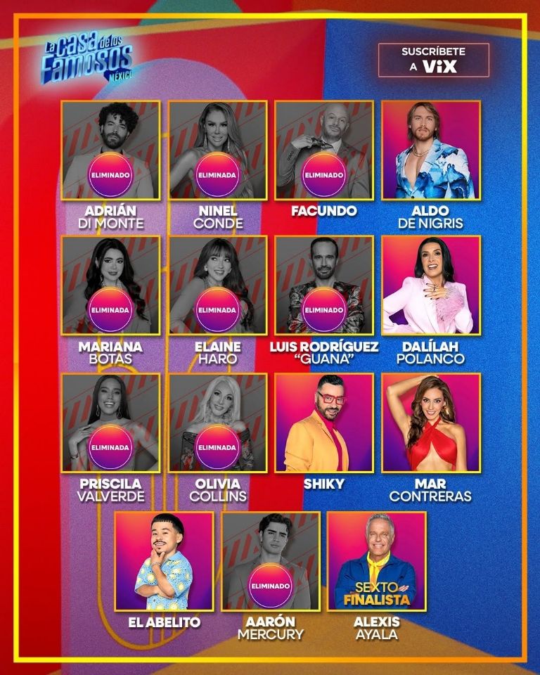Entre los finalistas que llegaron a la recta final se encontraban Abelito, Alexis Ayala, Mar Contreras, Dalílah Polanco, Shiky y Aldo de Nigris. Sin embargo, el 1 de octubre, Alexis fue el primer concursante en despedirse al obtener el sexto lugar. Los cinco restantes compitieron hasta el día 70 por el cuantioso premio, que ahora se erige como el centro de atención antes de que las luces del hogar más seguido del país se apaguen.