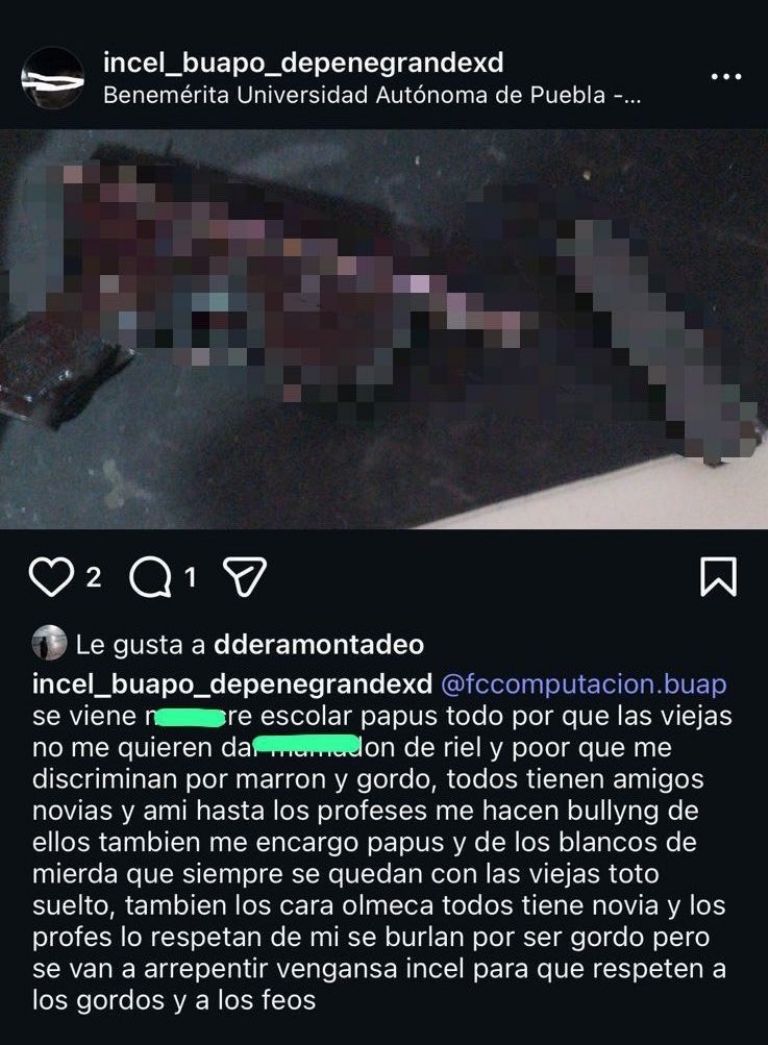 El mensaje compartido por Brandon “N” expresaba: “Facultad de Computación de la BUAP, se viene masacre escolar papus todo para que las viejas no me quieren dar mamadón de riel y porque me discriminan por marrón y gordo, todos tienen amigos, novias y a mí hasta los profes me hacen bullying, de ellos también me encargo papus y de los blancos de mierda que siempre se quedan con las viejas toto suelto, también los cara olmeca, todos tienen novia y los profes los respetan, de mí se burlan por ser gordo, pero se van a arrepentir, venganza incel para que respeten a los gordos y a los feos”.