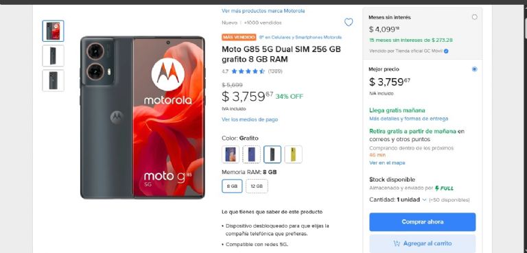 En Mercado Libre, este potente smartphone se encuentra disponible con un descuento aproximado del 35%. Esta promoción es ideal para compras inmediatas y suele incluir opciones de envío a domicilio y diversos métodos de pago, que pueden abarcar planes de financiamiento sin intereses. Es un ahorro considerable para un equipo con estas características, especialmente al considerar que configuraciones de 8 GB de RAM y 256 GB de almacenamiento suelen ubicarse en rangos de precios considerablemente superiores.