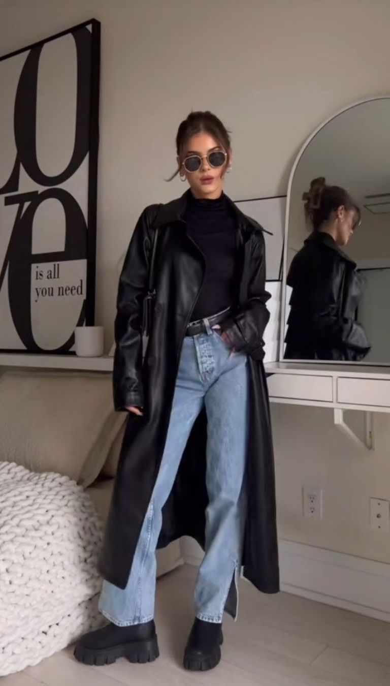 - Para un look urbano y audaz, combina tu abrigo de cuero con un conjunto monocromático en negro o gris oscuro. Complétalo con botas altas y un bolso de líneas estructuradas.