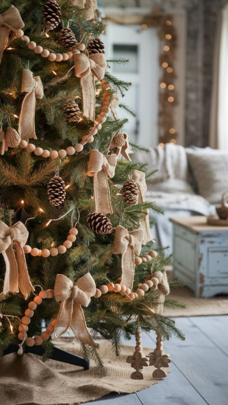 Las composiciones decorativas que priorizan la madera, el yute, los ramajes secos, los tejidos artesanales, el fieltro y la arcilla están ganando terreno significativamente en 2025. Estos adornos evocan un retorno a lo orgánico y un enfoque artesanal, más cercano a lo humano. Se pueden combinar sutiles toques metálicos (cobre, champán) para mantener la luminosidad, o incorporar figuras sencillas como estrellas de madera, corazones tejidos o diminutas campanas de bronce, logrando un equilibrio perfecto.