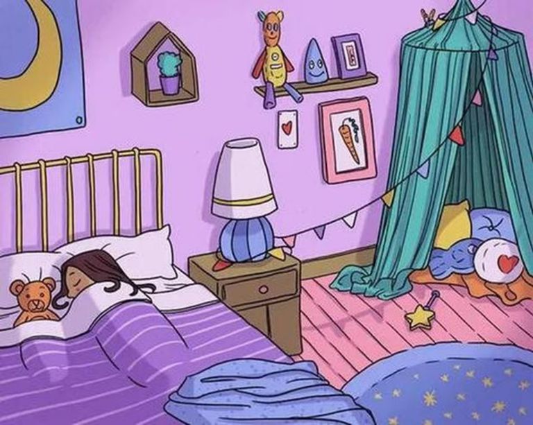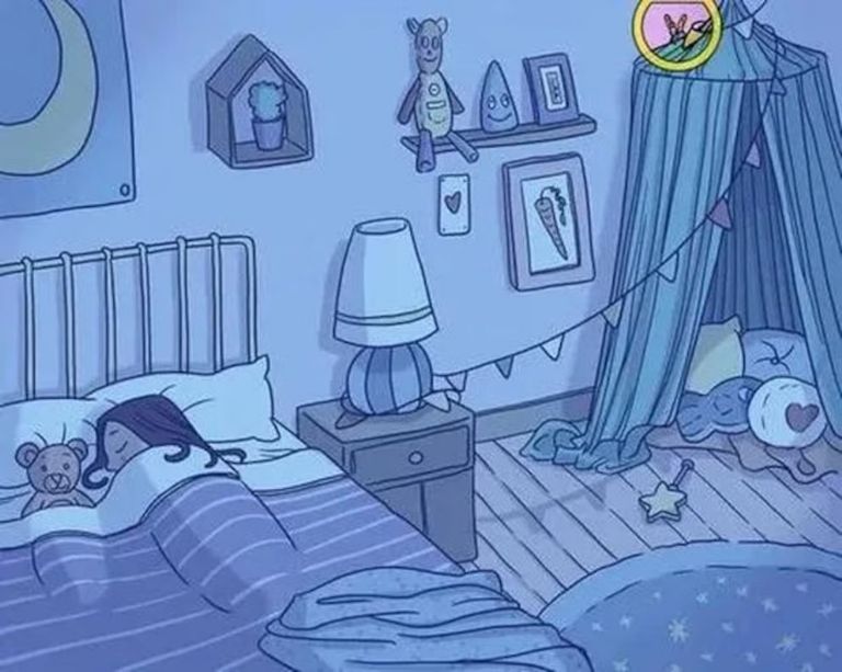 Prepárate para este nuevo desafío de percepción. Te presentamos una escena detallada: una habitación acogedora donde una niña duerme plácidamente junto a su inseparable osito de peluche. Tu misión, si te atreves, es encontrar el elemento que no encaja en esta tierna estampa.