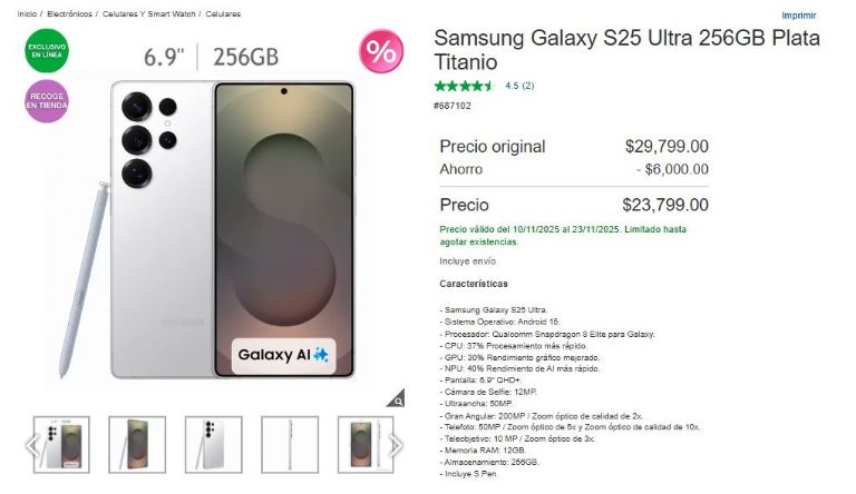 La tecnología de punta al alcance de tu mano. Costco presenta una oferta excepcional para el fin de semana del sábado 22 y domingo 23 de noviembre: un descuento de 6,000 pesos en el codiciado smartphone Samsung Galaxy S25 Ultra de 256 GB en acabado plata titanio. Hazte con él por tan solo 23,799 pesos, con envío incluido. ¡Importante! Esta promoción exclusiva aplica únicamente para compras realizadas en línea.