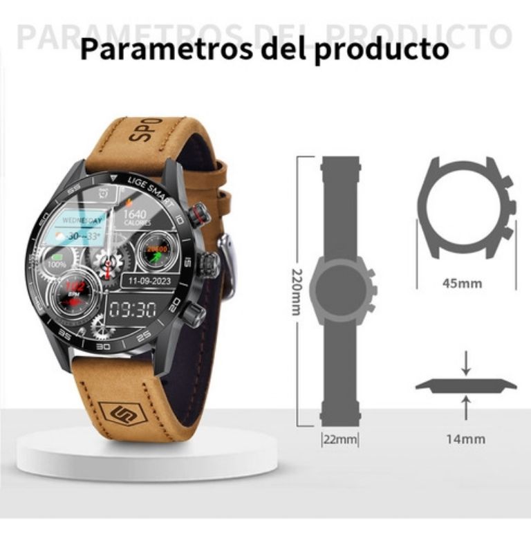 El reloj inteligente Lige para caballeros cautiva desde el primer instante por su estética: una estructura robusta, acabados metálicos premium y un estilo sofisticado que evoca la elegancia de los relojes tradicionales, pero potenciado con una pantalla táctil y la versatilidad digital. Esta fusión perfecta lo hace ideal para aquellos que aprecian un look más formal sin renunciar a las avanzadas funcionalidades de un smartwatch. Este modelo incorpora monitorización continua de la frecuencia cardíaca, seguimiento detallado del ciclo de sueño, podómetro preciso y múltiples modos deportivos, permitiendo una gestión integral de su salud y un seguimiento exhaustivo de su rendimiento físico.