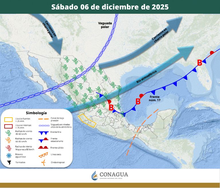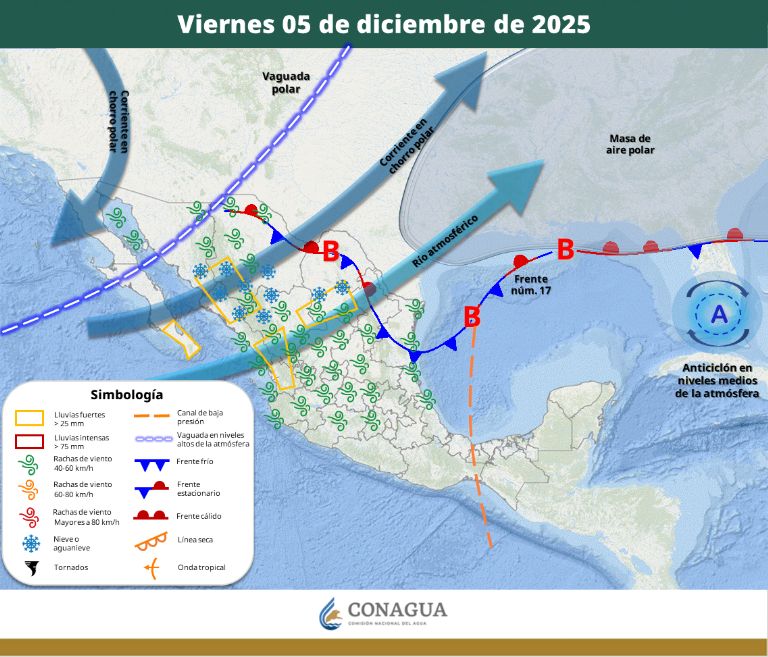 El frente frío número 17 mantendrá su presencia a lo largo del noreste del Golfo de México y el oriente del país, propiciando precipitaciones significativas. La masa de aire polar asociada continuará provocando temperaturas muy frías, especialmente durante la mañana y noche, en las regiones montañosas de la Mesa del Norte y la Mesa Central. Se pronostican vientos del norte con velocidades de 30 a 40 km/h y rachas de 50 a 70 km/h en Tamaulipas y Veracruz.